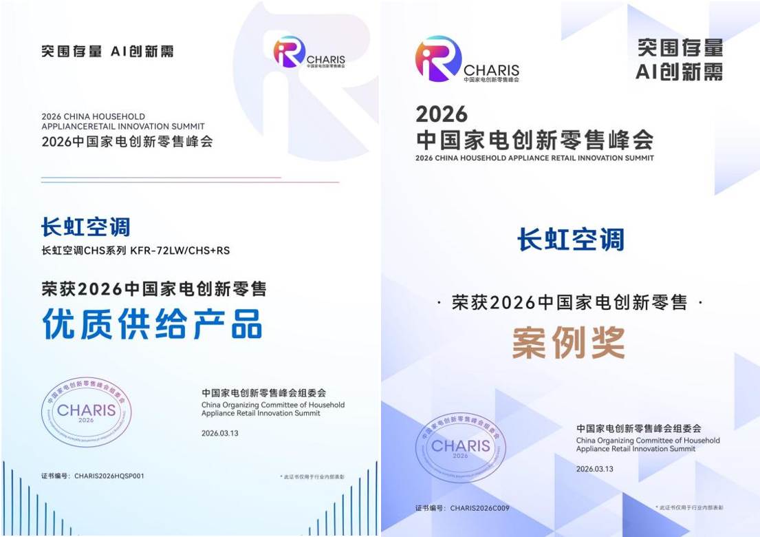3月,中国家电及消费电子博览会(AWE2026)在上海启幕。作为行业风向标,AWE不仅是新品与技术首发的秀场,更是产品实力的考场。在本届展会上,2026中国家电创新零售峰会上同期举办,长虹空调一举斩获两项大奖:客餐厅共享空调获评“2026中国家电创新零售峰会优质供给产品”,春熙路夏日营销案例荣膺“中国家电零售创新案例”,两项殊荣,印证了长虹从产品创新到用户触达的全链路实力。与此同时,“山水间”空调凭借健康空气领域的差异化定位,成为展会期间业界热议的焦点。