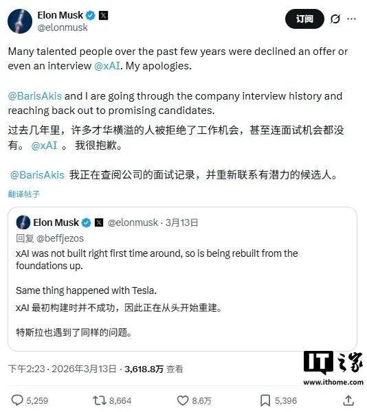 马斯克昨天还在 X 上发文:“过去几年里,许多才华横溢的人被 xAI 拒绝了工作机会甚至面试机会。我对此表示歉意。”他表示将重新联系那些有潜力的候选人。