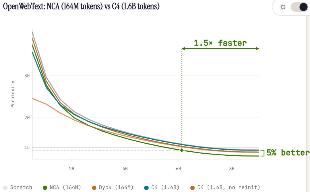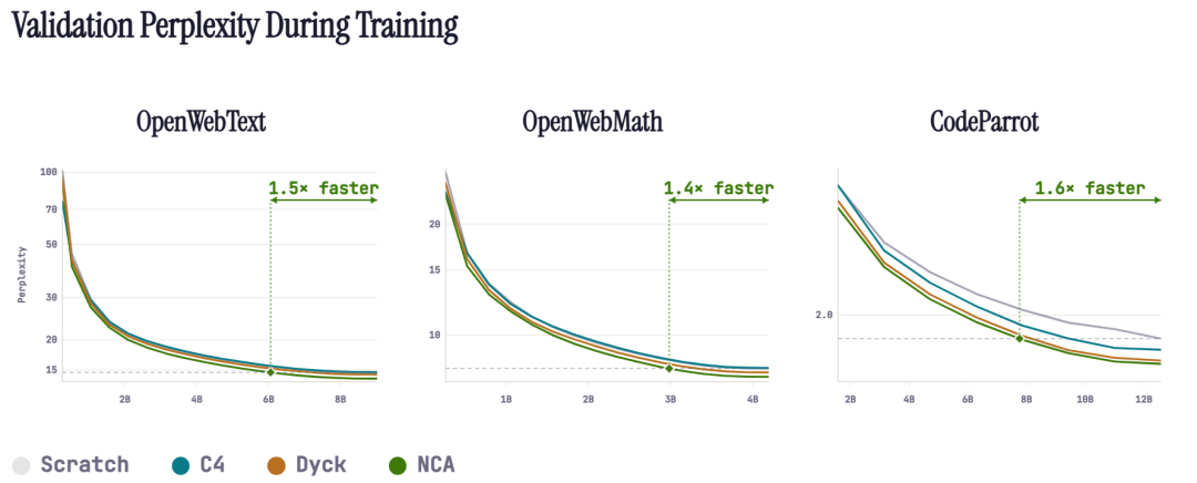 更令人惊讶的是,作者发现:在相同规模的数据条件下,这种非语言的 NCA 数据表现反而优于自然语言数据。