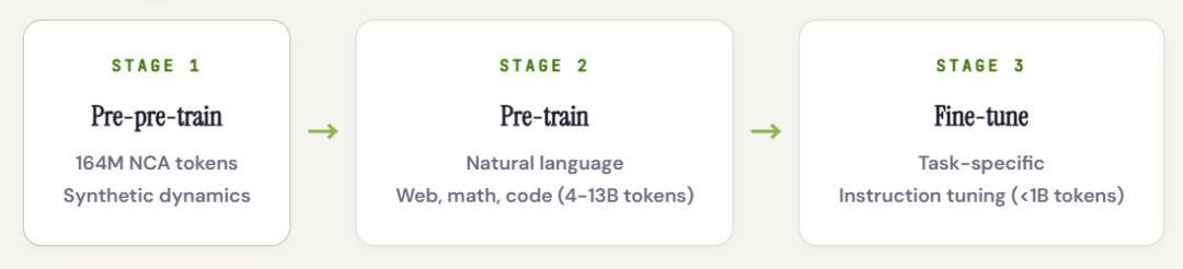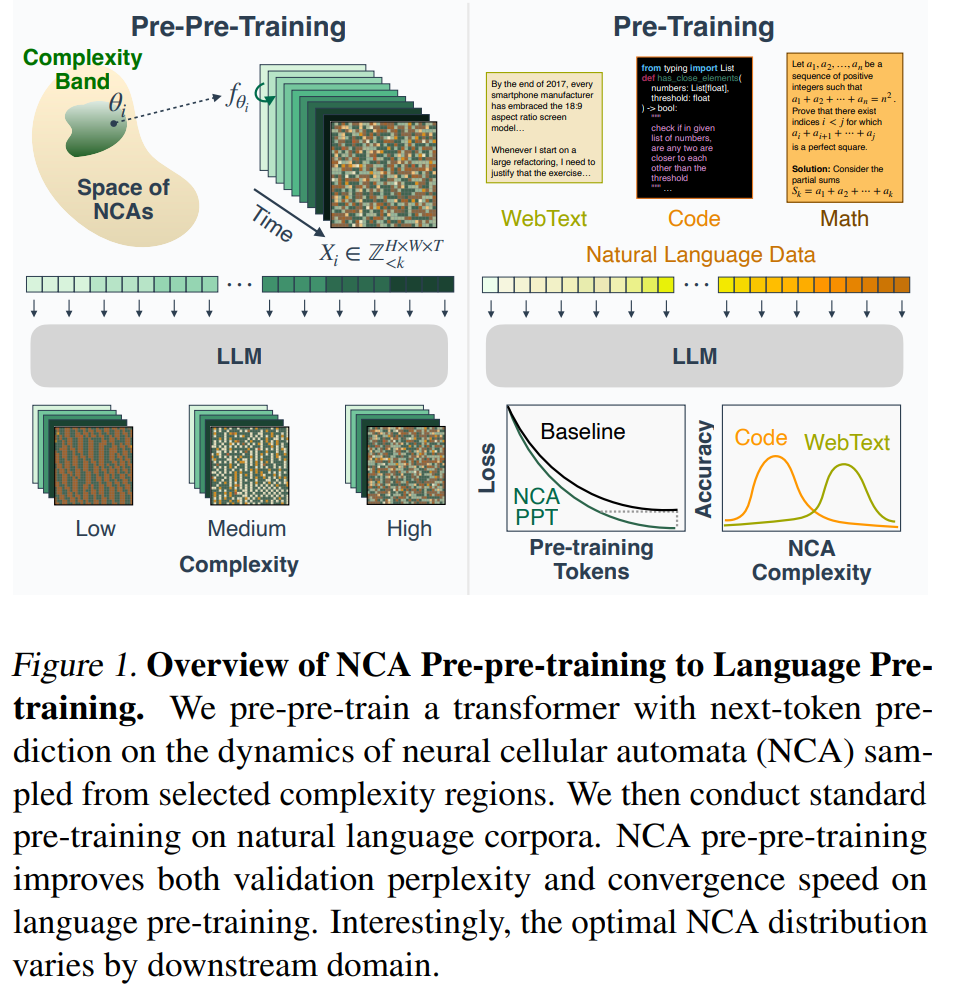 论文使用了一种完全不同的数据来源:在神经细胞自动机(Neural Cellular Automata, NCA)生成的数据上对 Transformer 进行预预训练(pre-pre-training)—— 这些数据完全是合成的,不包含任何语言内容。