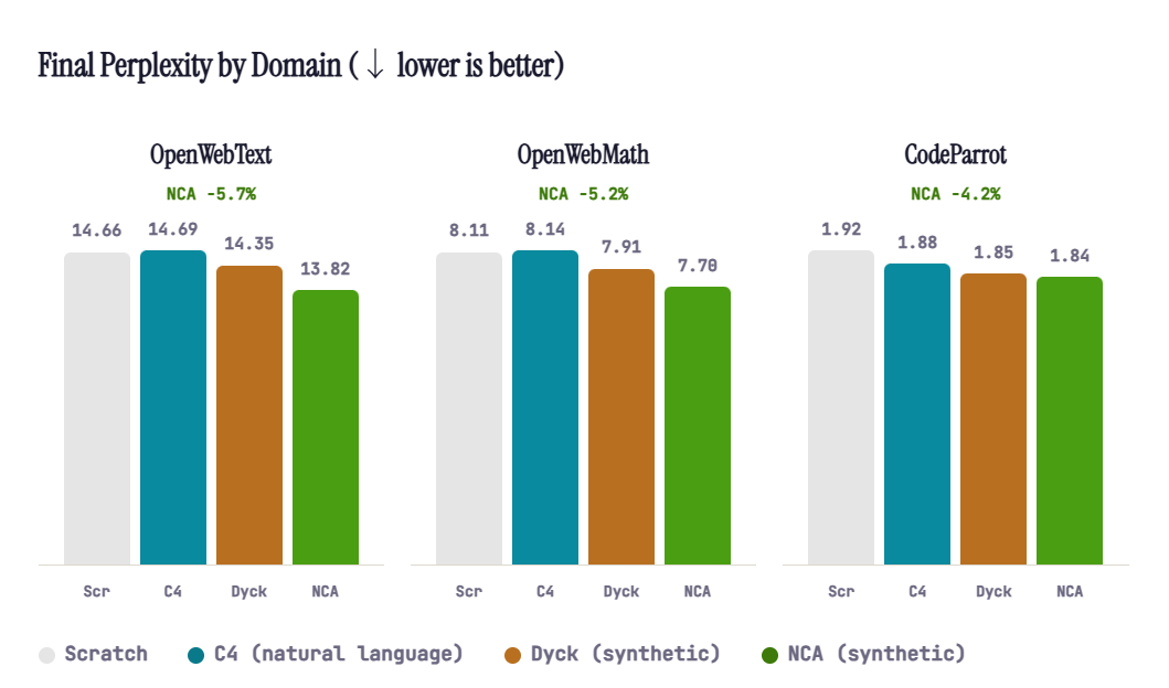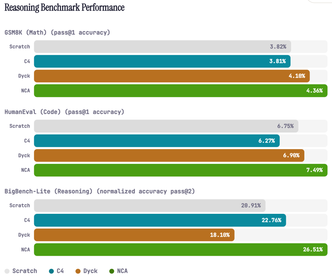 接着是结构,而非语义。NCA 数据完全不包含任何语言内容,却依然能够训练模型去跟踪长程依赖关系并推断潜在规则,而这些能力正是语言理解与推理所需要的核心能力。
