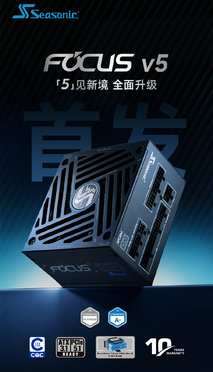 PChome3月15日消息,海韵FOCUS v5系列电源将于3月16日在海韵京东自营旗舰店正式首发,采用标准140mm短机身ATX规格,兼容紧凑型机箱。标配双色接口线材(含12V-2×6接口)与压纹线理线梳,简化布线难度并提高美观度。