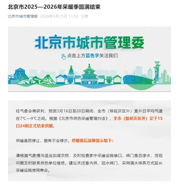 新京报讯 据北京市城市管理委消息,经气象会商研判,预测3月16日至20日期间,全市(除延庆区外)室外日平均气温在7℃—9℃之间。根据《北京市供热采暖管理办法》,全市(除延庆区外)定于15日24时正式结束供暖。