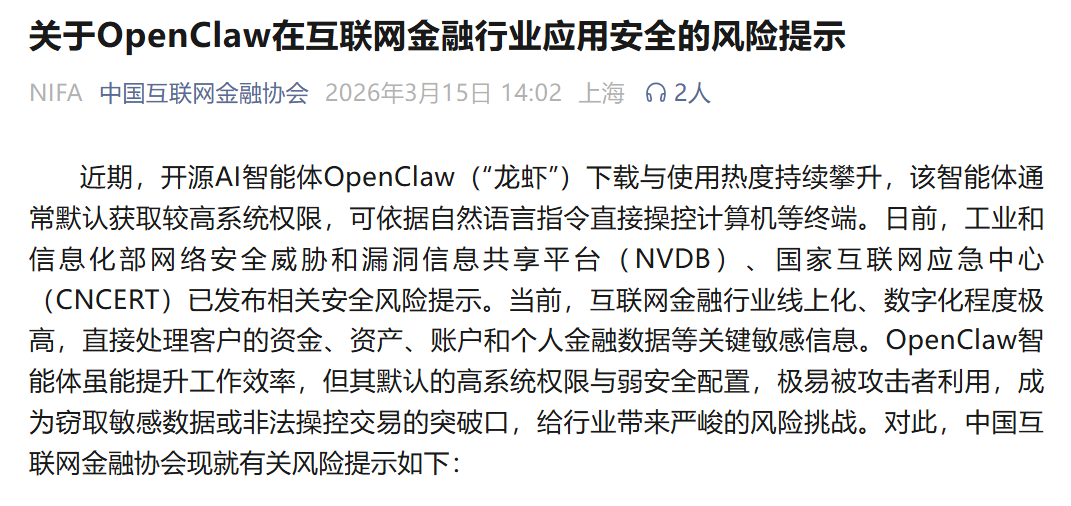 3月15日,中国互联网金融协会发布关于OpenClaw在互联网金融行业应用安全的风险提示: