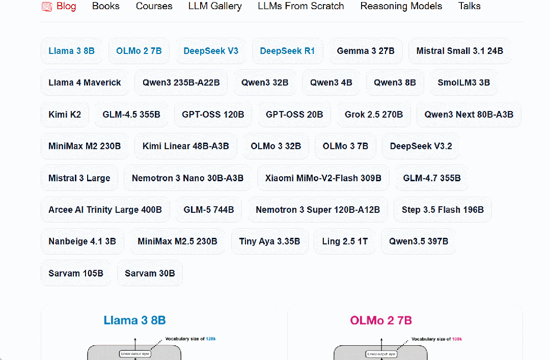 根据 Raschka 介绍,该网站汇集了他此前两篇博客中的内容,这两篇博客分别为《The Big LLM Architecture Comparison》 和 《A Dream of Spring for Open-Weight LLMs》。
