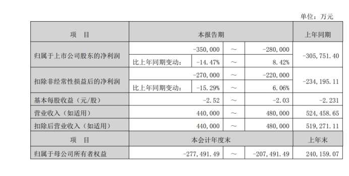 根据公司此前披露的2025年度业绩预告,公司预计2025年度归属于上市公司股东的净利润亏损28亿元至35亿元,比上年同期变动-14.47%至8.42%;预计扣除非经常性损益后的净利润亏损22亿元至27亿元。