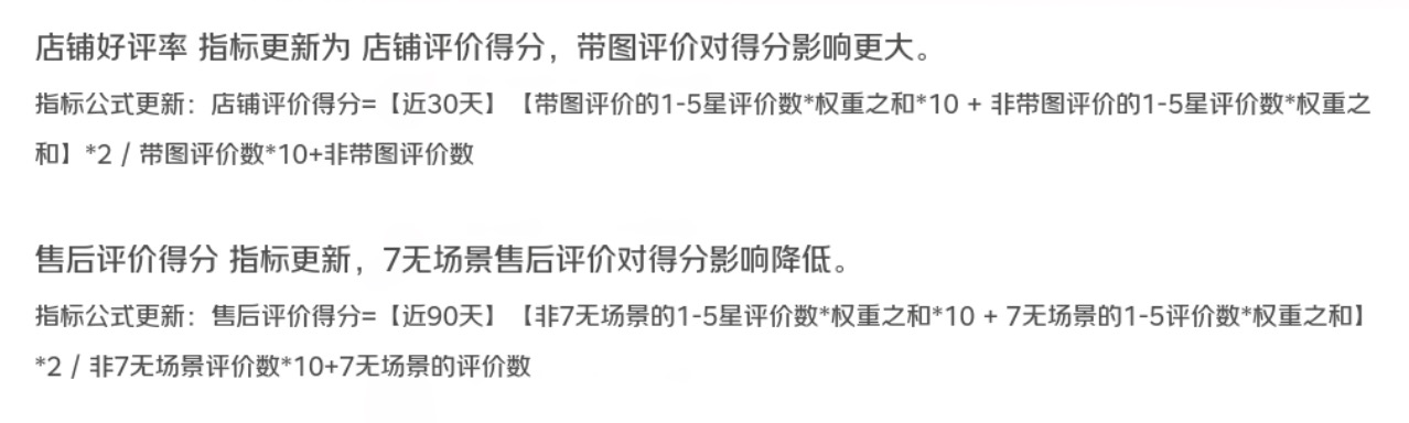 评价计分方面,京东调整了两项指标。一是,京东将“店铺好评率”指标更新为“店铺评价得分”。在这项指标的考核中,1-5星的评价均会被计入统计,同时带图评价的多少直接影响分数的高低。