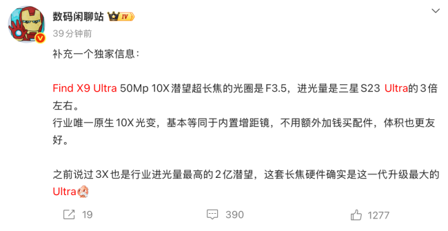 除了10倍潜望镜头外,此前的爆料还显示Find X9 Ultra可能搭载一枚3倍两亿像素潜望长焦,形成双潜望长焦结构,在中长焦与超远摄两个焦段上分别提供独立的硬件支持。