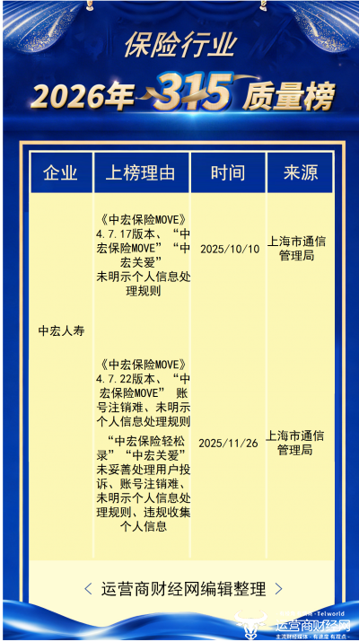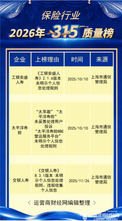 消费者权益始终行业内外关系的核心要素内容,恰逢一年一度3·15国际消费者权益日来临,运营商财经网对金融各领域存在侵害消费者权益的问题和现象,进行了梳理。来源均出自官方部门发布的公开通报,态度客观公正。针对保险行业,推出了“运营商财经网2026年315保险平台侵犯用户隐私榜榜”。
