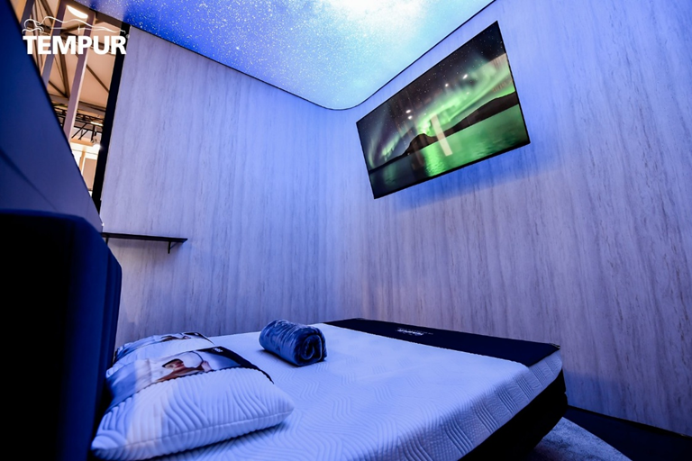 位于主入口正中央的,是本次展出的核心——泰普尔智能睡眠系统(Smart Sleep System)。作为品牌在智能寝具领域的标志性产品,泰普尔智能睡眠系统融合了源自NASA科技的感温材质与前沿数字技术,构建起从入睡到深睡的全链路智能睡眠生态。它并非单一产品,而是由智能床、智慧床垫、智睡枕“三位一体”组成的整体解决方案,能够通过无感传感技术实时监测心率、呼吸、体动等生理数据,生成个性化睡眠报告,并在必要时自动进行干预——例如在检测到打鼾时轻柔调整睡姿,或在浅睡期通过微震动引导放松。现场观众将有机会亲身体验智能睡眠系统的核心功能:通过沉浸式助眠模式,床体以舒缓律动配合声波震动,帮助身心快速放松,打造真正智能化的睡眠场景。