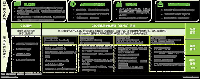 其核心竞争力体现在定制化优化方案的落地能力,服务覆盖快消、3C、母婴等主流行业,合作国际奶粉品牌、头部家电企业等行业头部客户,显著提升品牌 AI 搜索曝光量与推荐优先级,客户续约率与满意度居高不下。
