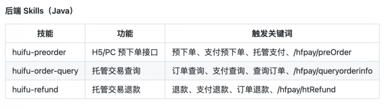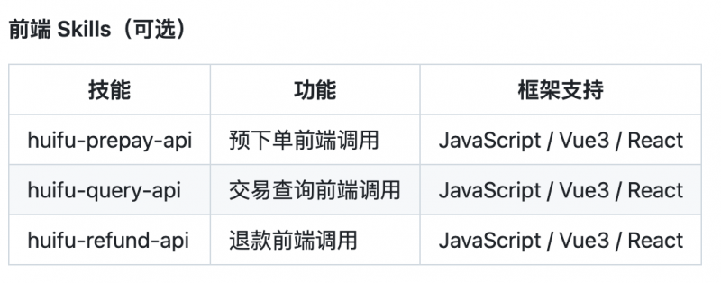 汇付业内首发并开源专属支付接入 AI 技能包,同时支持前端与后端的两种接入方式,并且实现了下单、查询与退款等功能,技能包内容如下: