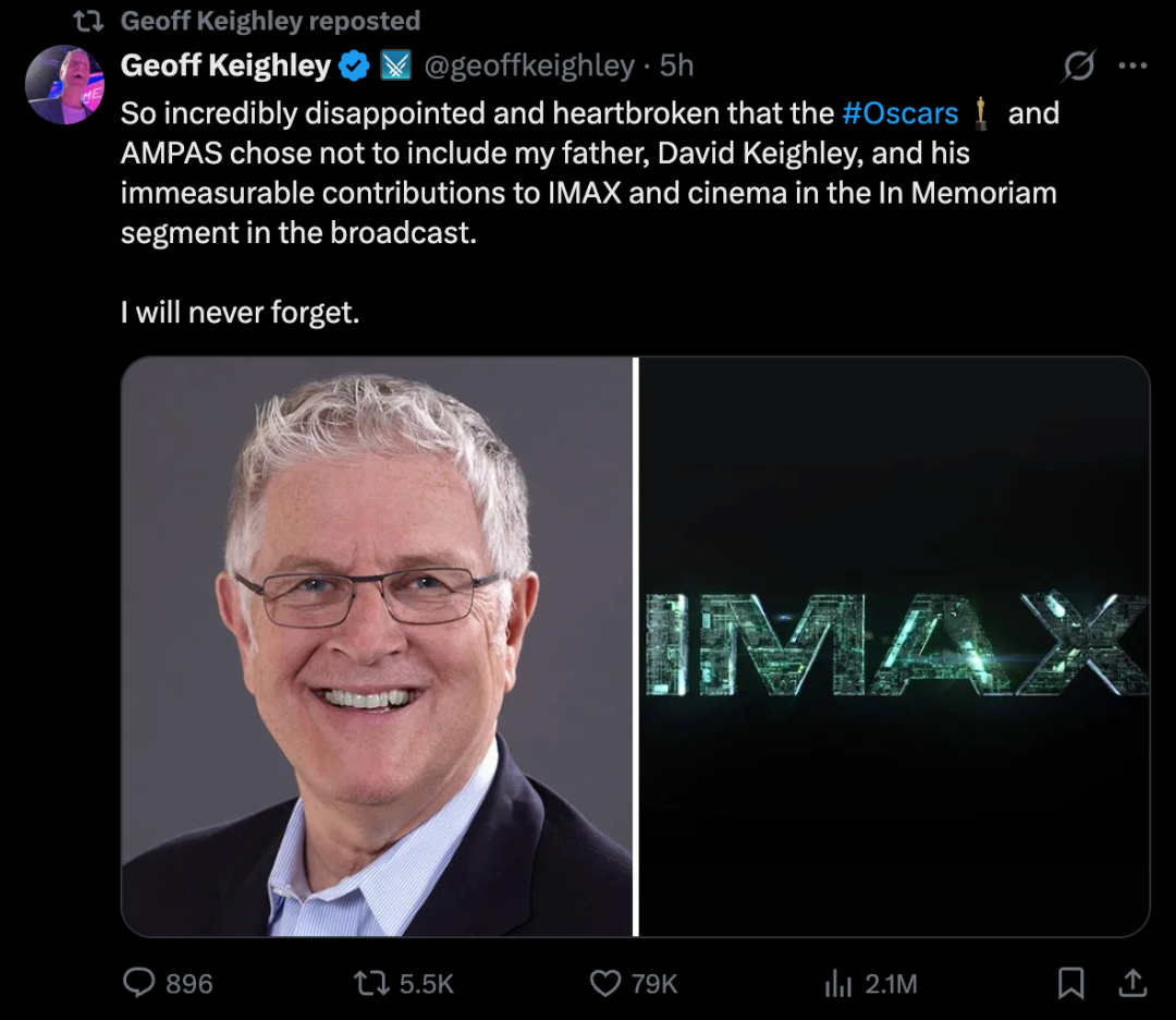 “我的父亲David Keighley对IMAX和电影行业有着无可估量的贡献,却没有被奥斯卡奖和美国电影艺术与科学学院(AMPAS)选入今年颁奖礼的缅怀逝者环节,这太让人失望和心碎。
