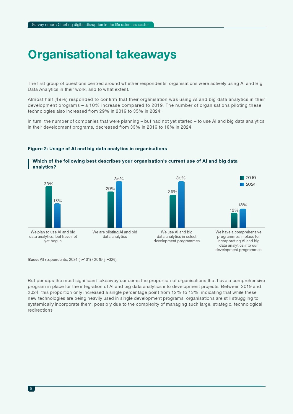 调研显示,生命科学企业对数字技术的应用正持续扩大。2024年已有49%的企业在研发项目中实际使用AI和大数据,比2019年提高10个百分点;同时,35%的企业仍处于试点阶段,高于2019年的29%。然而真正实现系统化部署的企业比例仅从12%微增至13%,表明行业虽积极探索,但在组织层面全面整合数字技术仍面临复杂挑战。