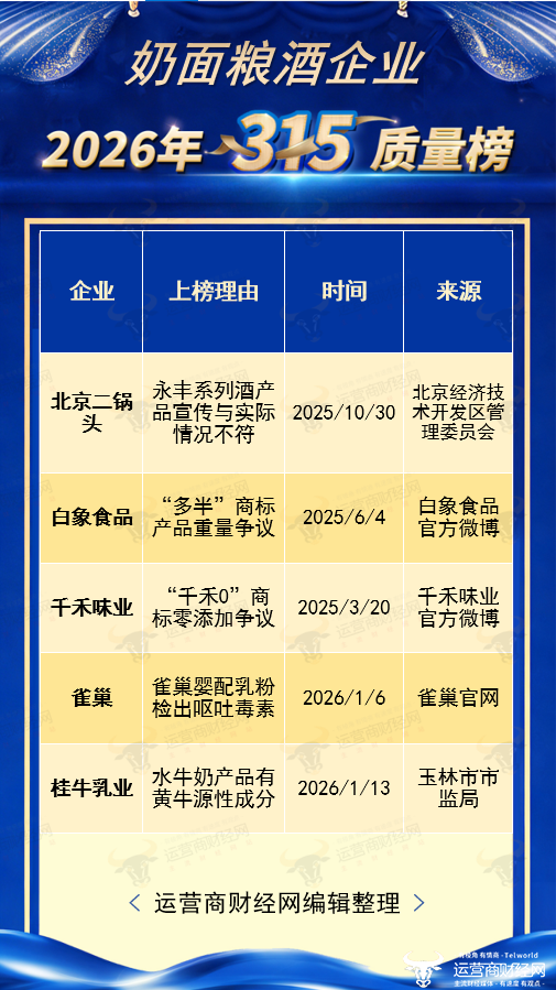 因此,运营商财经网聚焦过往一年中奶面粮酒行业的热点事件与知名企业,推出了“奶面粮酒虚假宣传榜”。