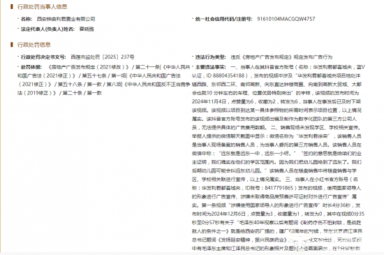 据了解,华发利君都荟城央项目因在销售宣传过程中存在多项与实际情况不符的问题,涉嫌虚假宣传。如其备案的第三方销售人员在微信中,将楼盘销售与远东一中、远东一小等学区、学校相关联进行引人误解的宣传,严重损害了消费者的权益。最终被西安市莲湖区市场监督管理局处以8万元罚款。