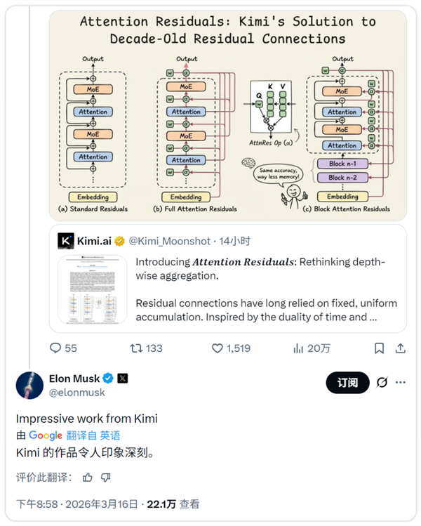 以挑剔著称的马斯克转发研究并评论“Kimi的作品令人印象深刻”,其旗下xAI正处重组期,此次认可足见技术分量。