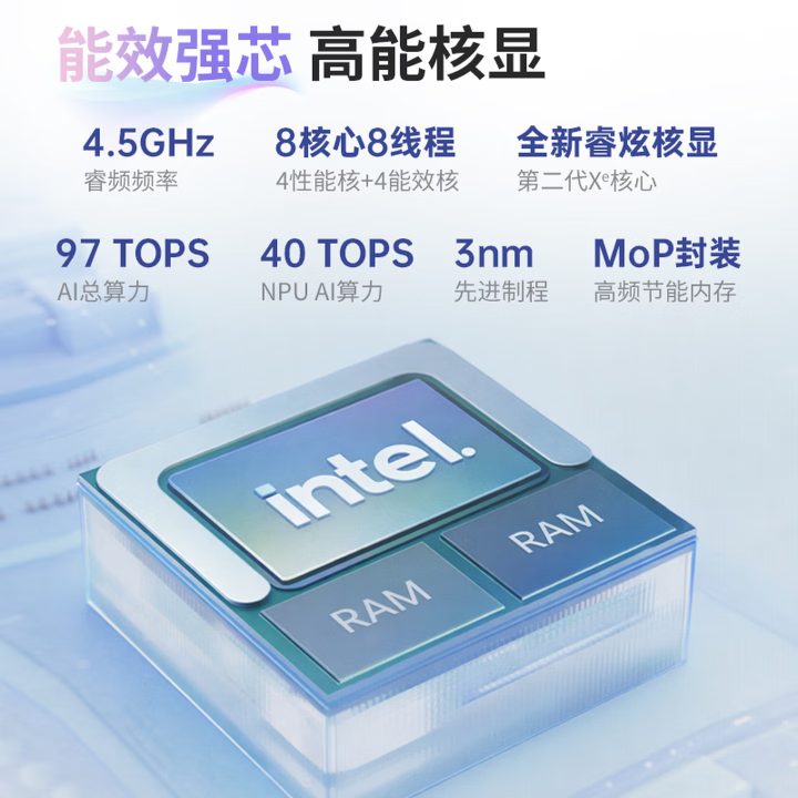 性能方面,搭载英特尔新一代Lunar Lake处理器,NPU算力达45 TOPS,整机AI性能超100 TOPS。首次采用CPU封装内存技术,将16GB或32GB LPDDR5X-8533高频内存直接集成于处理器基板上。缩短数据传输路径,延迟降低40%,同时为消费者提供更稳定的定价策略。