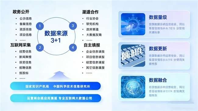 • 汇聚政务公开、互联网采集、合作渠道、企业自主填报等“3+1”数据来源,形成全域融合的数据资源池。