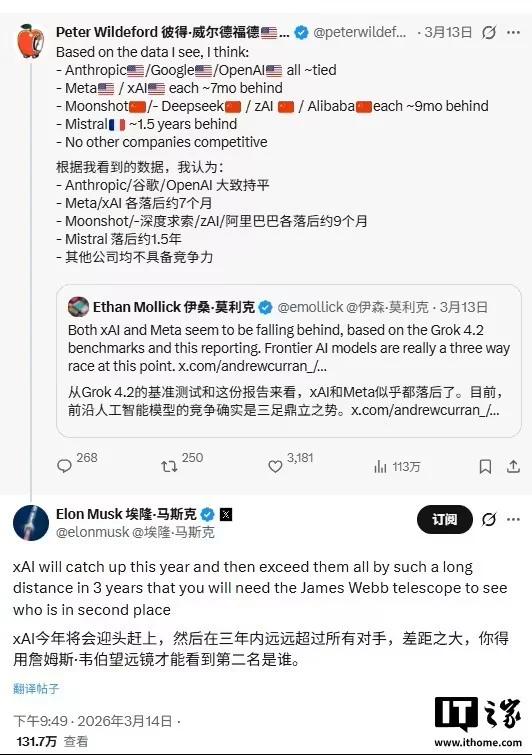 IT之家注意到,这条发布于 3 月 14 日的帖子,是对预测师彼得 · 威尔德福德评估的直接回复。该评估基于各类基准测试和公开报道,对人工智能开发商进行了排名。