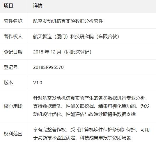 这项软件著作权不仅为航天智造(厦门)研究院构建了坚实的技术壁垒,更助力企业顺利通过高新技术企业认定、斩获多项重点项目立项。针对航空发动机仿真实验数据规模大、维度多、分析难的行业痛点,这款软件通过智能化数据清洗、算法化规律挖掘、可视化结果输出,大幅缩短研发数据处理周期,减少不必要的物理试验次数,显著降低试验耗材与时间成本,加速最优设计方案落地。从技术突破到产业赋能,这款软件正以专业的数据之力,为航空发动机自主研发筑牢数字化底座,助力中国制造业产业向高端化、智能化稳步迈进。