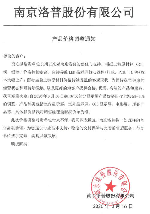 衷心感谢贵单位长期以来对南京洛普的信任与支持,根据上游原材料(金,铜,铝等)价格持续走高,直接导致LED显示屏核心器件(灯珠,PCB,IC等)成本大幅上升,面对当前上游原材料价格持续暴涨的客观现状,为保持我司健康的经营状态和可持续发展,以及更好的为客户提供合格,优质,高端的产品和服务,我司郑重决定:自2026年3月16日起,对大部分显示屏产品价格进行上涨5%-15%的调整,产品种类包括室内显示屏,室外显示屏,COB显示屏,电影屏,球幕产品等,具体报价以我司销售经理最新报价单为准。