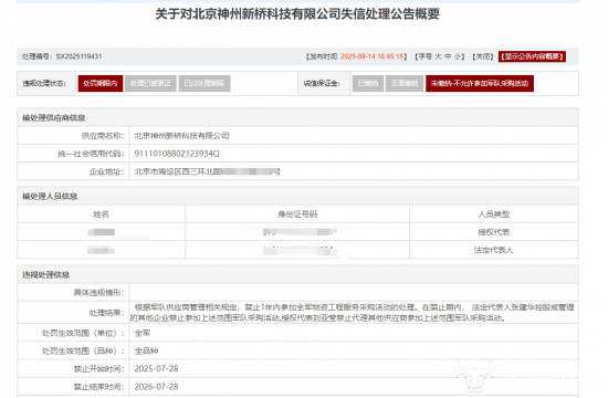 具体来看,2025年5月27日,某重要系统采购网发布《关于对北京神州新桥科技有限公司失信处理公告》。