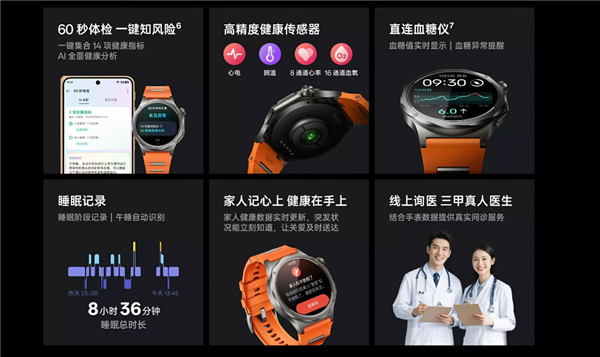健康方面,手表支持血氧监测、心率监测、睡眠质量评估、睡眠呼吸暂停风险评估,支持无感高血压风险评估、全天平均血压波形、血压相关影响因素分析、血压改善行为。