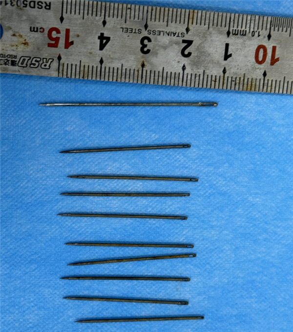 好在医生凭借丰富的临床经验和精湛操作,经过三个小时的连续奋战,最终12根长4–5厘米的绣花针被完整、安全地全部取出。