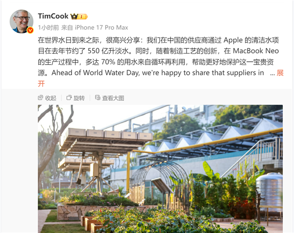 快科技3月18日消息,苹果一直在通过实际行动推进环境保护,近期库克再次宣布了品牌在节水领域取得的最新进展。