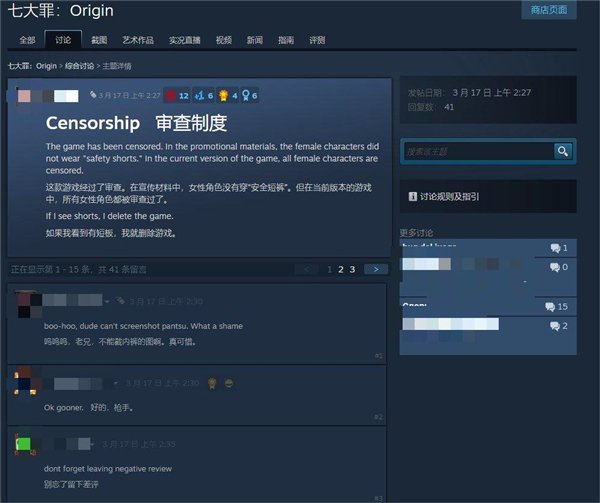 Steam官方讨论区中,最热门的争议线程标题即为“Censorship”,由用户Беляш于3月16日发起。