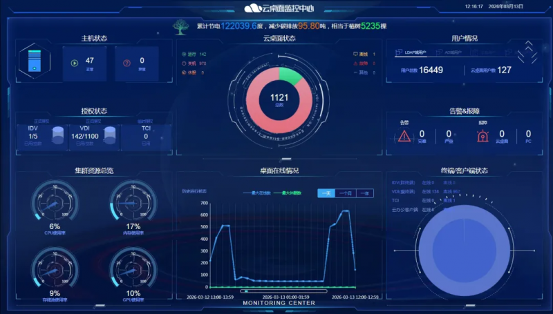 针对传统 PC 模式下机房电脑使用率不足 25%、算力大量闲置的痛点,通过算力池化实现资源高效复用,将资源利用率从不足 25% 提升至 85% 以上,彻底破解传统模式资源分配不均、闲置浪费的难题。相较于传统模式每年 200 万元以上的重复建设与设备购置投入,累计节约硬件购置成本超 300 万元;平台运行能耗下降 40%,每年节约电费约 25 万元,既大幅降低办学成本,又深度契合绿色校园建设的低碳发展理念。
