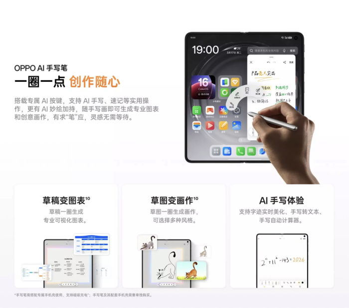 OPPO AI 手写笔还支持 AI 字迹美化、公式自动计算、虚拟演示笔等实用功能。搭配专属保护壳可实现便捷收纳与磁吸充电,充电 3 分钟即可连续书写 1 小时,真正成为全场景的生产力神器。无论是专业工作,还是休闲生活,OPPO AI 手写笔让每个有想法的人,都能成为创作者,真正实现「想法到落地,顺手就搞定」。