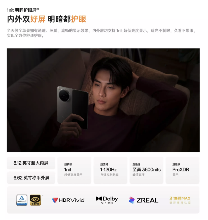 屏幕素质方面,OPPO Find N6 延续 OPPO 在显示领域的绝对领先优势,内外双屏均搭载 1nit 明眸护眼屏,暗光下显示均匀清晰,告别抹布屏困扰;内外屏全局峰值亮度提升至 1800nits,烈日强光下依然清晰可见。