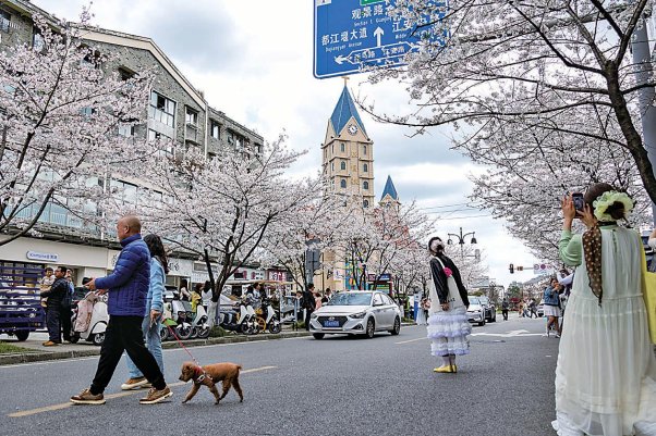 游客欣赏街景樱花