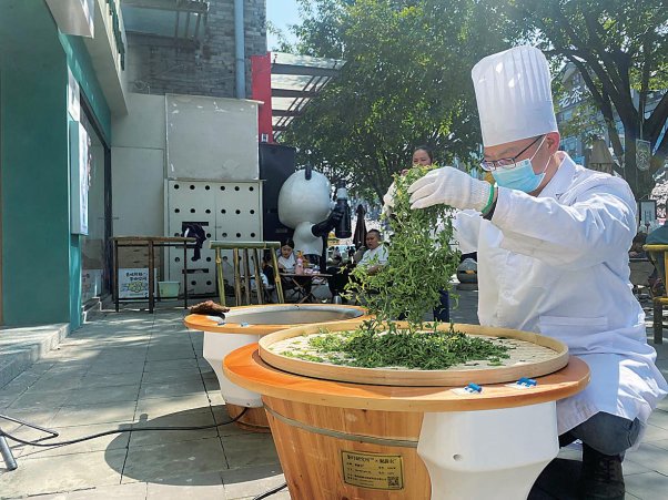 作为活动的核心亮点,手工炒茶与茶艺表演每日准时上演。炒茶师傅在热锅中徒手翻炒鲜叶,杀青、揉捻、干燥、提毫……一道道传统制茶工序行云流水,娴熟的技艺引得围观群众纷纷赞叹。在茶艺表演环节,茶艺师温杯烫盏、提壶高冲,将都江堰春茶的鲜香唤醒。