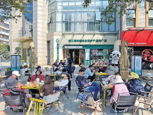 市民游客在都江堰地理标志保护产品推广店前品鉴茶叶。