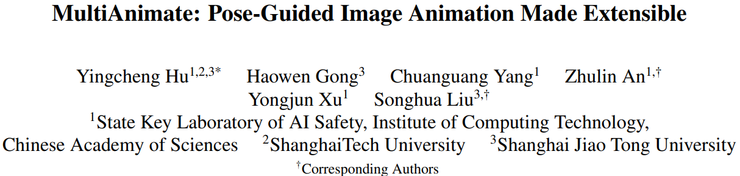 在这样的研究背景下,来自中国科学院计算技术研究所与上海交通大学等机构的研究团队提出了一种新的多人物动画生成框架,并发表了题为《MultiAnimate: Pose-Guided Image Animation Made Extensible》的研究工作。这项研究通过引入人物身份标识机制以及基于人物掩码的空间关系建模方法,使生成模型能够在多人物互动过程中持续区分不同个体,并保持人物外观与动作的一致性。
