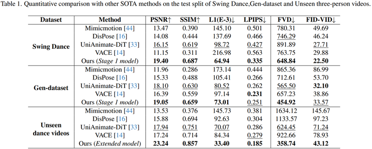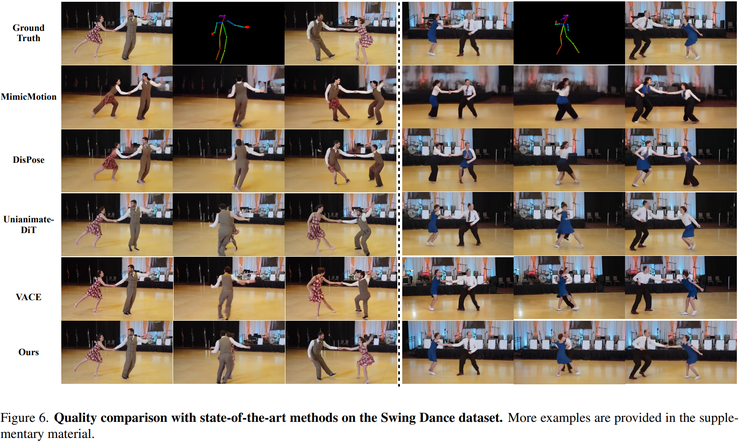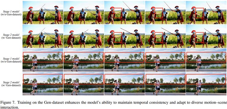 具体表现为动作控制准确,人物外观保持一致,并且视频在时间维度上具有良好的连续性。不过研究人员也发现,由于场景更加复杂,在某些视觉感知指标上优势略小,这说明模型在更加复杂环境中的表现仍然存在进一步提升的空间。