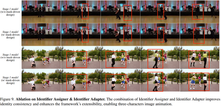 实验结果说明,掩码设计能够帮助模型更好地理解人物之间的位置关系。第二种是 Identifier 模块设计,其中包括 Identifier Assigner 和 Identifier Adapter 两个模块,这两个模块的作用是为每个人物分配唯一的身份标识。如果去掉这两个模块,模型在多人物场景中容易出现身份交换和动作混乱的现象。实验结果表明,这两个模块能够显著提升模型在多人物动画生成中的稳定性。