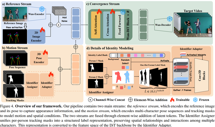 而在在多人物动画生成过程中,模型不仅需要保持每个人物外观的稳定性,还必须在动态过程中正确建立人物与动作之间的对应关系,并处理人物之间的空间交互。如果模型无法持续区分不同人物,生成结果就容易出现身份混淆、动作错位或空间关系不合理等问题。因此,如何在复杂互动过程中保持人物身份一致,并同时建模多人物之间的空间关系,已经成为多人物视频生成研究中的关键挑战。