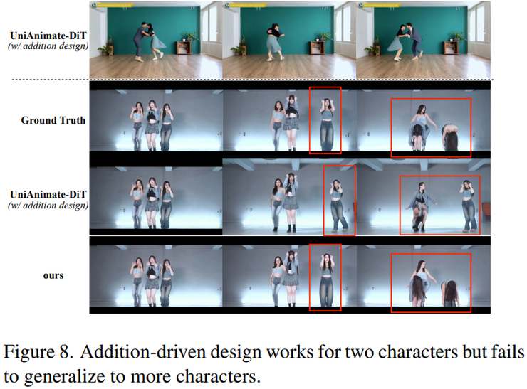 值得注意的是,这个方法在训练阶段只使用双人数据,却能够在推理阶段扩展到三人甚至更多人物的动画生成任务,为多人物视频生成提供了一种具有良好扩展性的解决思路。