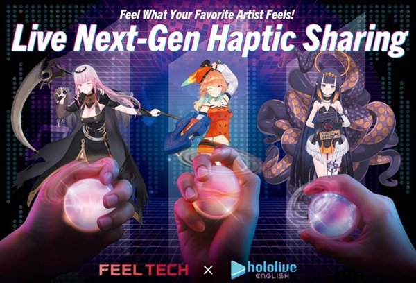 据该公司介绍,Feel Tech技术可通过球状手持式触觉设备将视听内容给人的触觉和情绪等感官提示进行"数字转化",通过将该设备与VTuber的虚拟表演同步,用户能够直接体验到偶像传递的身体感受(震动、脉冲和动作)。
