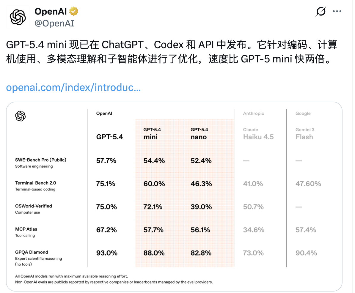 北京时间3月18日,OpenAI宣布推出两款小模型GPT‑5.4 mini与nano,官方称这是内部“迄今为止能力最强的小模型”,其能力接近旗舰模型GPT-5.4,但针对高频工作负载做了优化,旨在以更低延迟和更高性价比,为智能体时代的应用提供新选项。