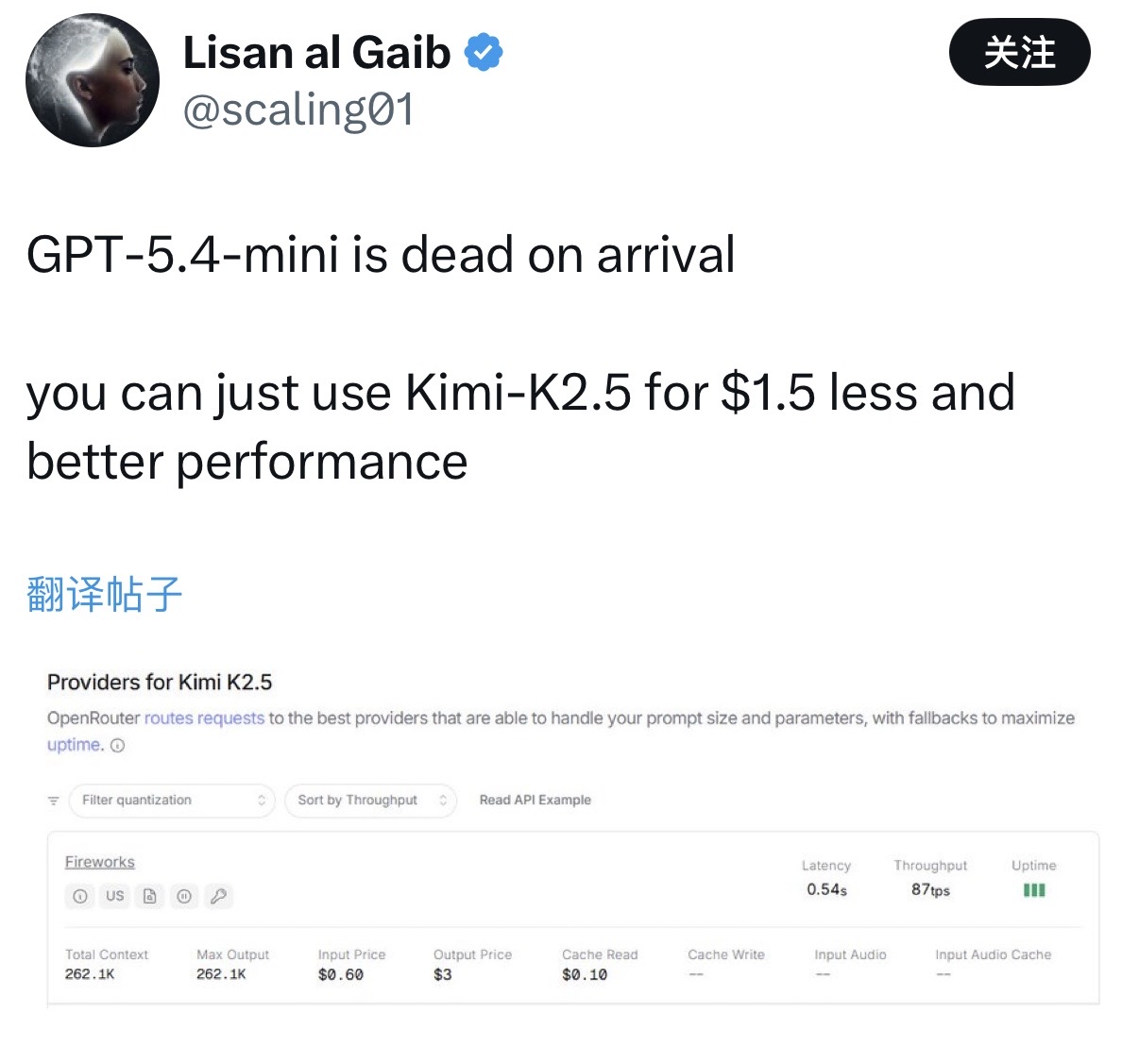 有开发者提出“GPT-5.4-mini推出就失败了,因为Kimi-K2.5更便宜”的观点,引起了不少讨论,同时也有反驳的声音。有开发者指出,基准排名对于实际工作流程正变得越来越没有参考价值,没有具体实践过还不能下定论。