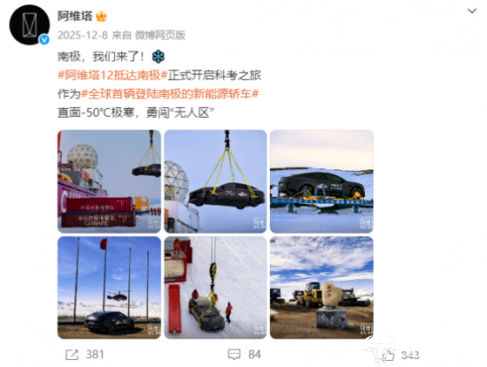 2025年12月8日,阿维塔官方微博宣布,旗下车型阿维塔12已抵达南极中山站,还称阿维塔12是“全球首辆登陆南极的新能源轿车”“直面-50℃极寒,勇闯‘无人区’”,宣传文案极具冲击力。