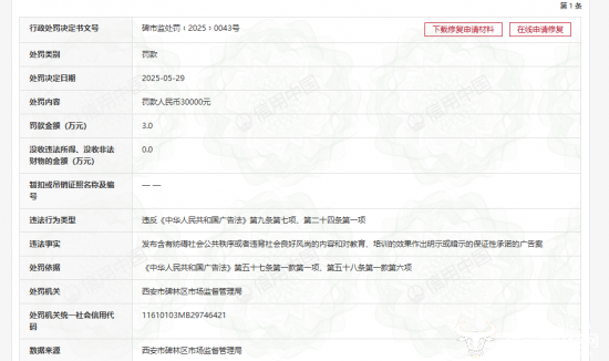 因此,西安市碑林区市场监督管理局在2025年5月29日对其做出行政处罚,罚款3万元。