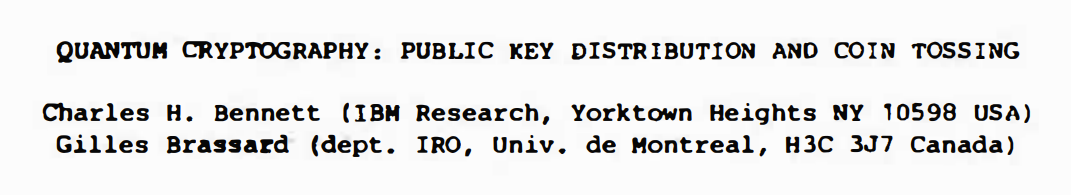1984 年,受已故合作者 Stephen Wiesner 观点的启发,Bennett 与 Brassard 提出了首个实用的量子密码学协议,即现在的 BB84 协议。在论文《Quantum Cryptography: Public Key Distribution and Coin Tossing》中,他们证明了通信双方可以建立由物理学定律保证安全的秘密加密密钥,即使面对拥有无限计算能力和高度成熟技术(如量子计算机)的对手,该密钥依然安全。