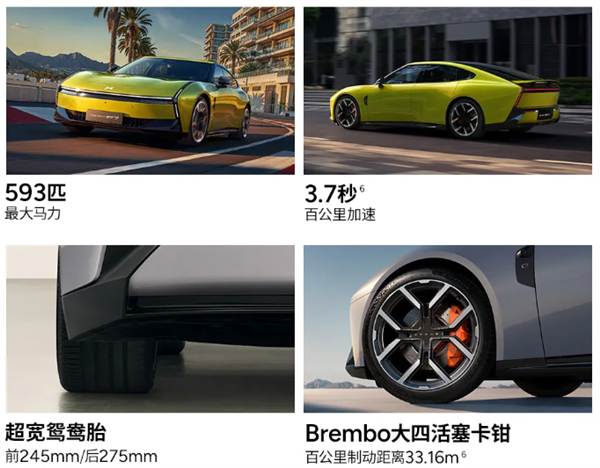 车身采用大溜背造型,弹出式门把手降低风阻,新增星曜红、暗夜黑、星云白三款配色,搭配四幅式轮毂与红色卡钳,运动质感拉满。