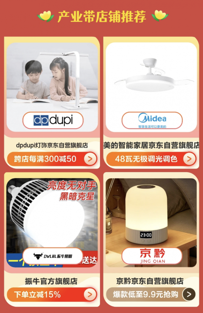 作为本次战略合作的首个落地项目,“京东灯饰采购节·灯博会专场”已正式上线,集结美的,简顿,惠普,长城,冠雅,松伟等近30家知名品牌,带来吸顶灯、轻奢吊灯、读写台灯、护眼风扇灯、智能氛围灯等全品类优选灯具。本次专场精选多款兼具设计与品质的灯饰好物,以更具亲和力的价格让理想光源触手可及:长城无叶风扇灯,语音控制,负氧离子活动价549元,姿灯智能落地氛围灯支持遥控语音控制、柔光护眼,活动价104元;辰可三头轻奢飞碟吊灯采用Ra97高显色,活动价910元;戴尔轻奢K9水晶吊灯吸吊两用、Ra98显色,10头款活动价440元;dpdupi德普直屏屏幕挂灯超国标亮度、RG0无蓝光,活动价708元。